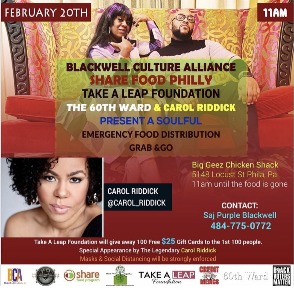 Blackwell Culture Alliance – Share Food Philly – Take A Leap Foundation Food Distribution Grab & Go When: February 20th @ 11AM Where: Big Geez Chicken Shack – 5148 Locust Street Philadelphia, PA Take A Leap Foundation will give away 100 Free $25 Gift Cards to the first 100 People Special Appearance by the Legendary […]